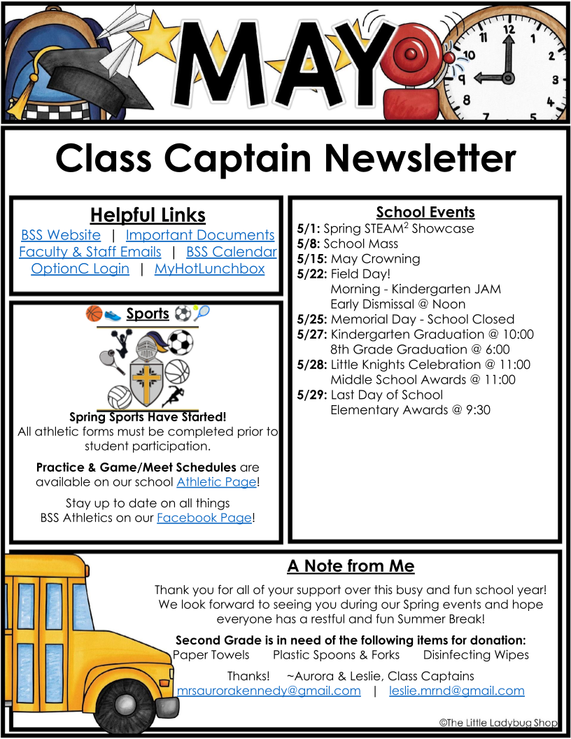 | Halloween: Friday, 10/31 Christmas: Thursday, 12/18 Valentine's Day: Thursday, 2/12 Easter Egg Hunt: Tuesday, 3/31 Class Captains should create a Sign Up Genius to organize party supplies! You should have received information for the BSS Volunteer Sign Up Genius Account from Marcie Letvak, our Event Coordinator. (mletvak@bssknights.org) | Food donations benefit the Little Portions Food Pantry!